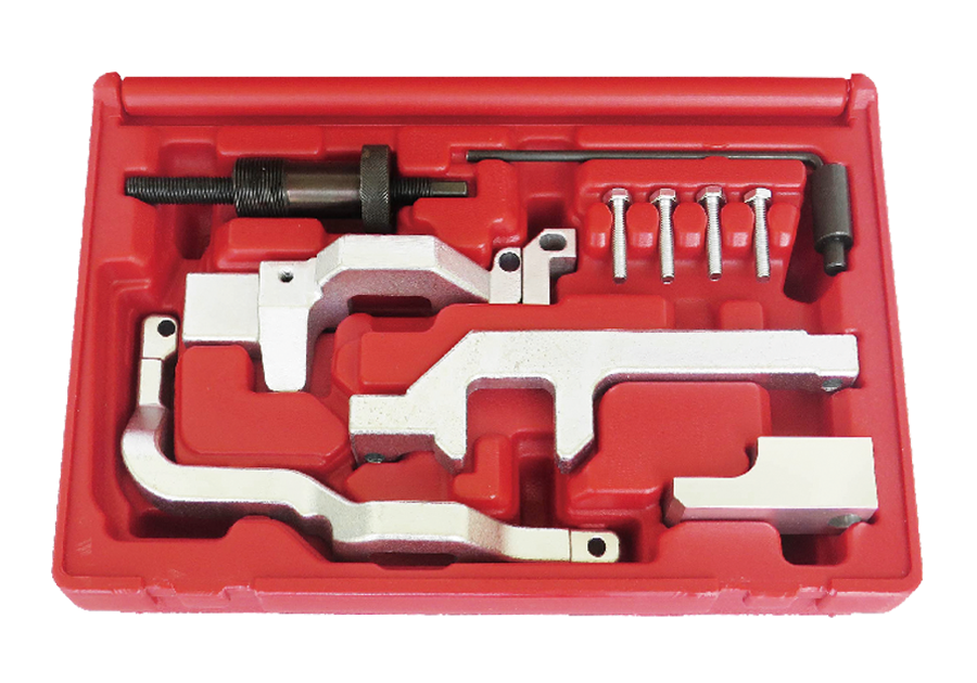 The set includes camshaft setting tool, crankshaft locking pin & chain tensioner tool