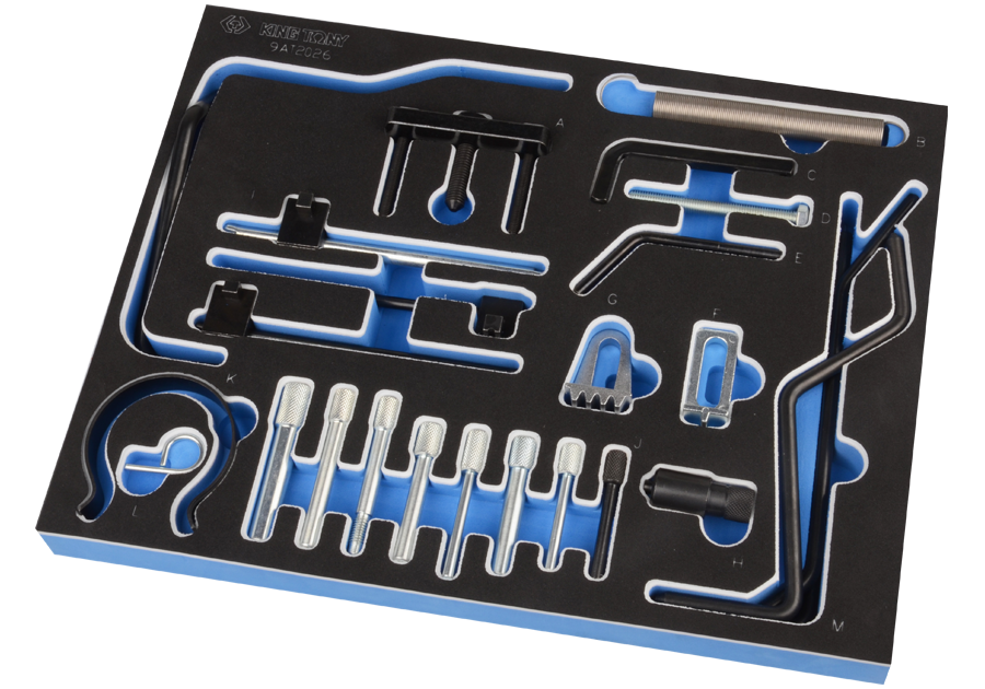 The set includes special flywheel tools and cam/crankshaft timing pin